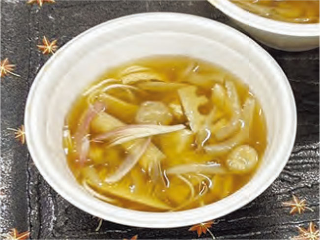 女川のおぞうには、もちと、だいこん、にんじん、ごぼうの千切り、まめもやし、しみどうふ、セリなど、具だくさんのしょうゆ味。子どもたちが、女川町食生活改善推進委員会のみなさんといっしょに作った。食材を提供した㈱石巻青果の門間 義典さんは「地域の食材をもっとみなさんに知ってもらいたいので、伝統食、行事食のおぞうにをみんなでつくって食べることはすばらしいです」と話していた。参加した子どもは「にんじんがかたく千切りが意外とむずかしかった」と話していた。