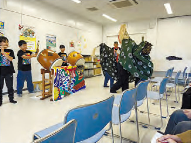 おぞうにを食べたあと、女川小獅子振り隊による獅子振りの発表があった。鈴木 碧虎さんは「頭をかんだ時のお客さんの笑顔を見ることがやりがいです。 大人に負けない演技をめざして中学校でも続けていきます」、佐藤 弥里さんは「獅子の顔やつなげる言葉が地域によって違うところが魅力です。 盛り上げてくれるお客さんが演技の力になります。」と力強い言葉で話した。ふたりとも獅子振り隊の創設メンバーだ。
