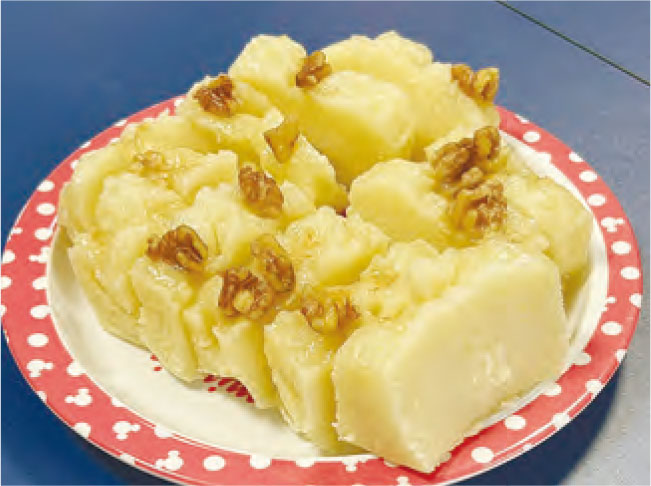 次にながし焼きづくりに挑戦。ホットプレートに生地を流し込み、表面に気泡が出てきたら、ひっくり返す。そのまま食べてもおいしいが、バターとはちみつをかける食べ方が子どもたちに人気だった。参加した黒田 哲太さんは「がんづきもながし焼きも初めて食べました。とてもおいしかったです」と話していた。