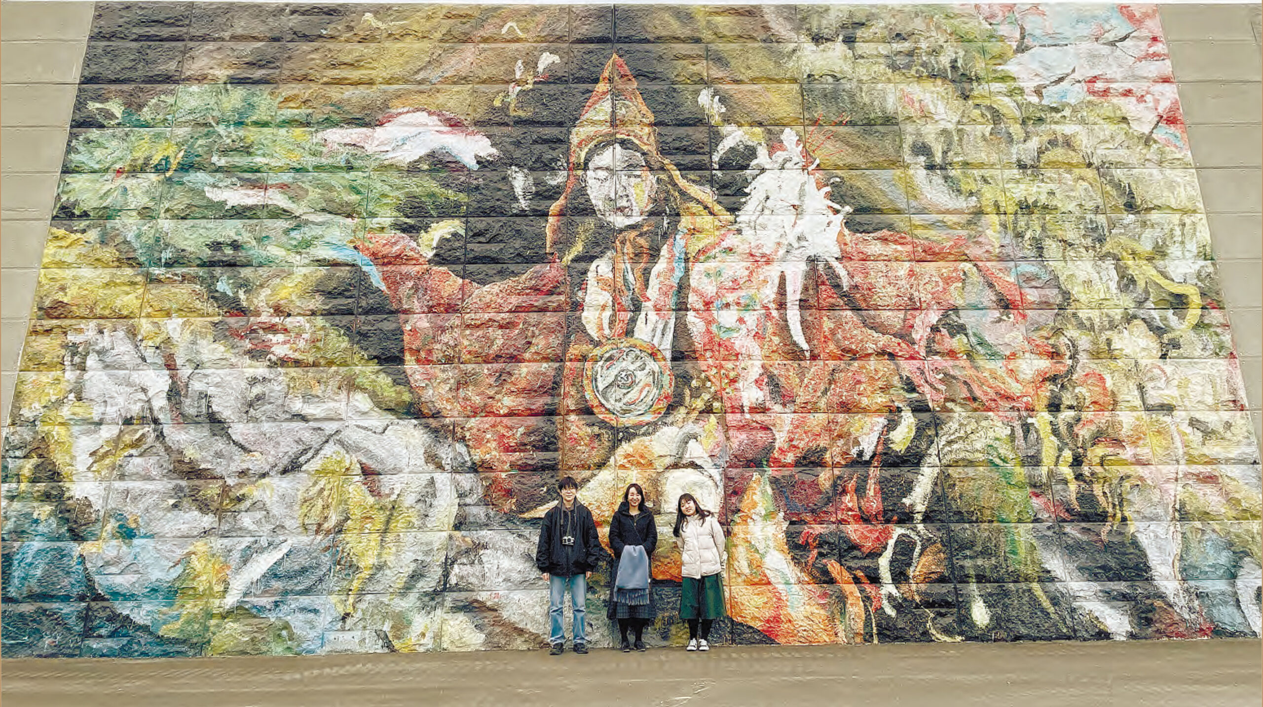 高さ9メートルの防潮堤に雄勝法印神楽をモチーフに描かれた壁画「岩戸開|The Opening」