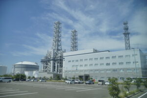 火力発電に使う燃料の液化天然ガス(LNG)は、-162℃に冷やすと元の大きさの600分の1になる。その性質を生かして、政治の安定している国から輸入している。輸入船を取り入れる桟橋には最大315mの船まで入るそうだ。船からLNGを移したら、気圧管理でガスに入れ替える。タービン本館の壁は2階までコンクリートでできていて電気設備が直接津波に当たらないよう対策していた。東日本大震災後、施設を津波から守るため、3.3mの防潮堤のほかに、5mの盛り土を作った。盛り土の上には植栽が24種類あり、大きく育てば森になるように配慮されている。