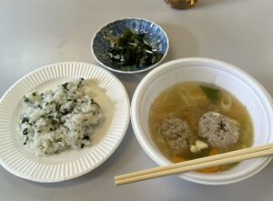 わかめごはん、さんまのすりみ汁、わかめの酢の物